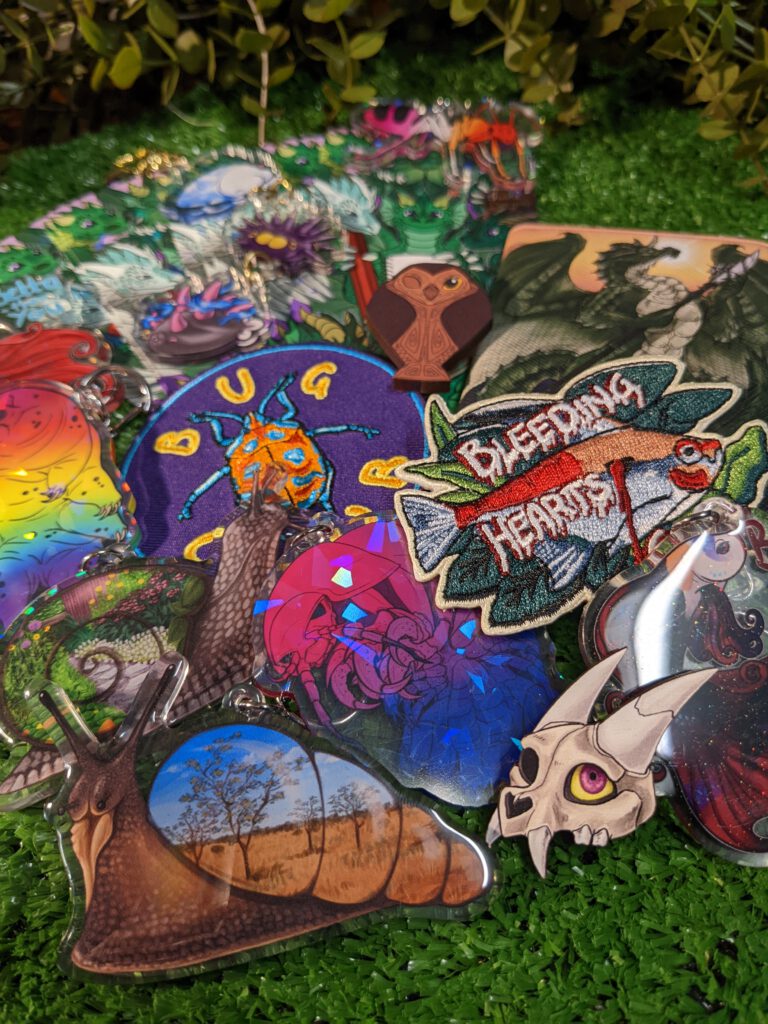 I love nature, from tiny bugs to extinct marsupials, my table reflects my love of the outdoors and native animals. Stickers, pins, lanyards, patches and keychains feature a range of little creatures to bring on adventures with you!