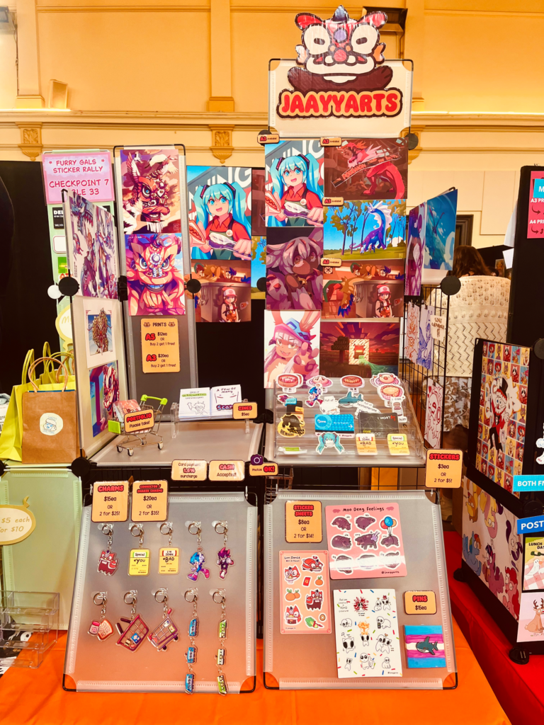 I’ve been a sole artist who sells merchandise at markets and conventions for two years in Melbourne and I had made my first interstate debut this July in Adelaide. I create a mix of both fan art and original content. Some fandoms that I create for are but not limited to: Jurassic Park, Pokemon and Sonic the Hedgehog. I as well tend to produce a notable amount of Aussie esque content to connect and relate to my local community.