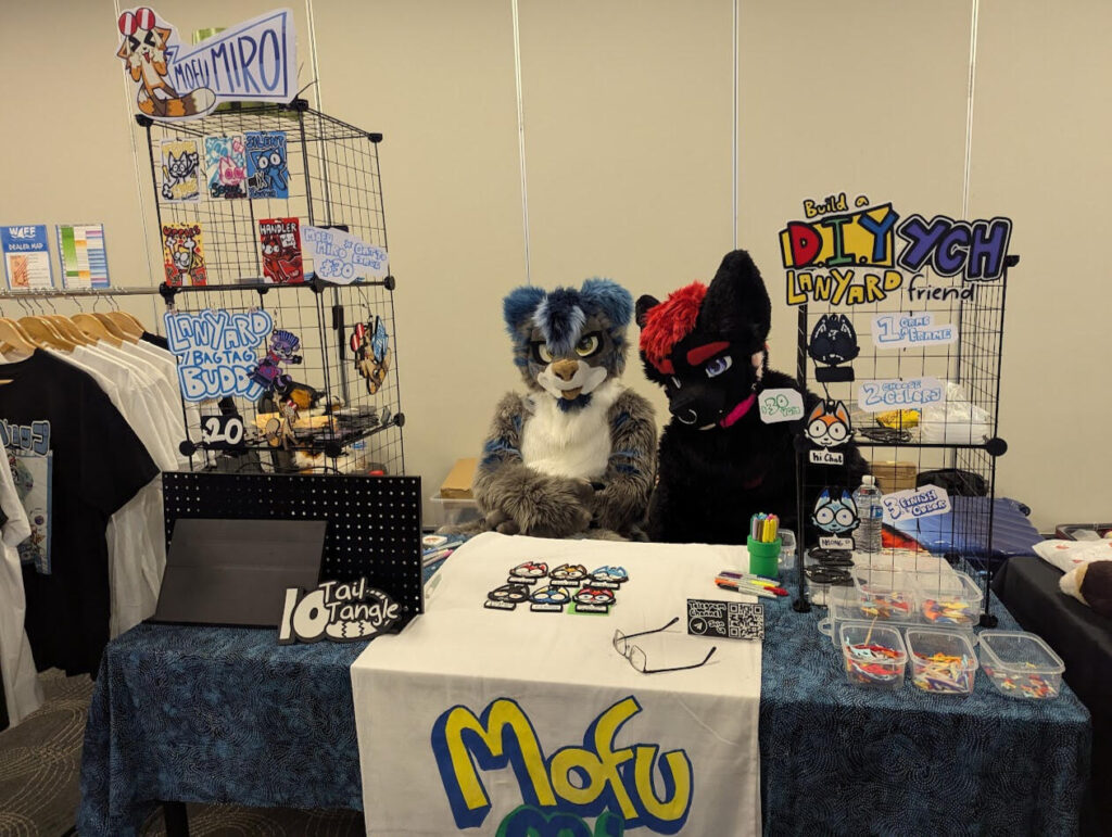Kiki Chaos Creations is a fursuit making business selling a variety of handmade items such as fursuit premades, parts, ear headbands, bags and more! Manufacturing items such as beanies, keychains, plushies and more can also be purchased at my table!