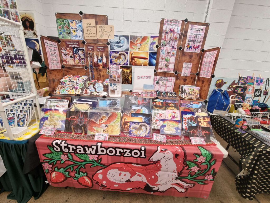 You’ll find a fun mix of more professional and unserious/derpy art at my booth. And hey, if you were wanting your commission fix, you can throw your sonas at me for custom art!! Fun, bright, colourful and quirky!! At my table you’ll find all kinds of merch like stickers, prints, pins and more, from both furry to other popular fandoms!