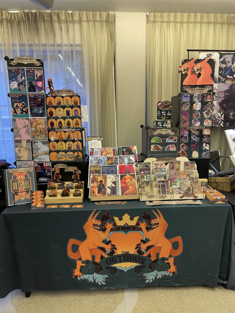 The Orthrus is a two headed dog duo from New Zealand with a love of the mythological, medieval and monstrous. Our merch work focuses on critters and creatures as well as honoring fandoms we love. We have been taking digital commissions for many years and love bringing our clients characters to life! We branched out into conventions in 2023 and never looked back.