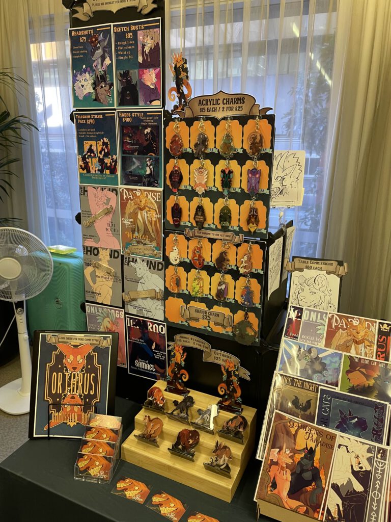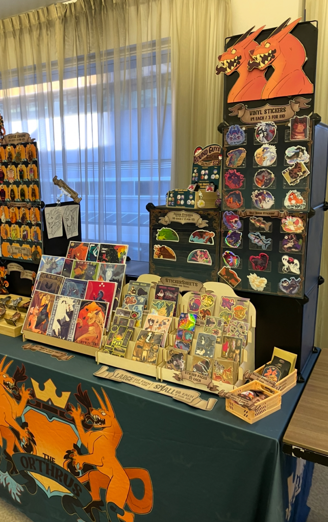The Orthrus is a two headed dog duo from New Zealand with a love of the mythological, medieval and monstrous. Our merch work focuses on critters and creatures as well as honoring fandoms we love. We have been taking digital commissions for many years and love bringing our clients characters to life! We branched out into conventions in 2023 and never looked back.