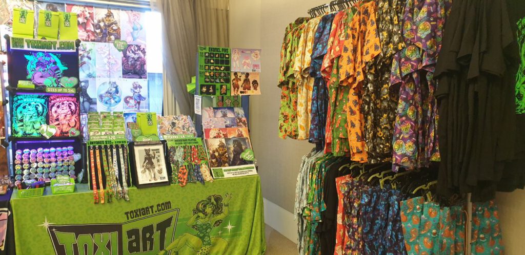 Colourful Furry related, size inclusive apparel, focused on beachwear and holiday vibes with a large range of cute animal patterns (all drawn and designed by myself) including Cotton Hawaiian shirts, boardshorts and new products like summer dresses and slip on sandals (also developing skirts and jumpers hopefully in time for MFC!) Also UV reactive/glow in the dark anthro character Tshirts.